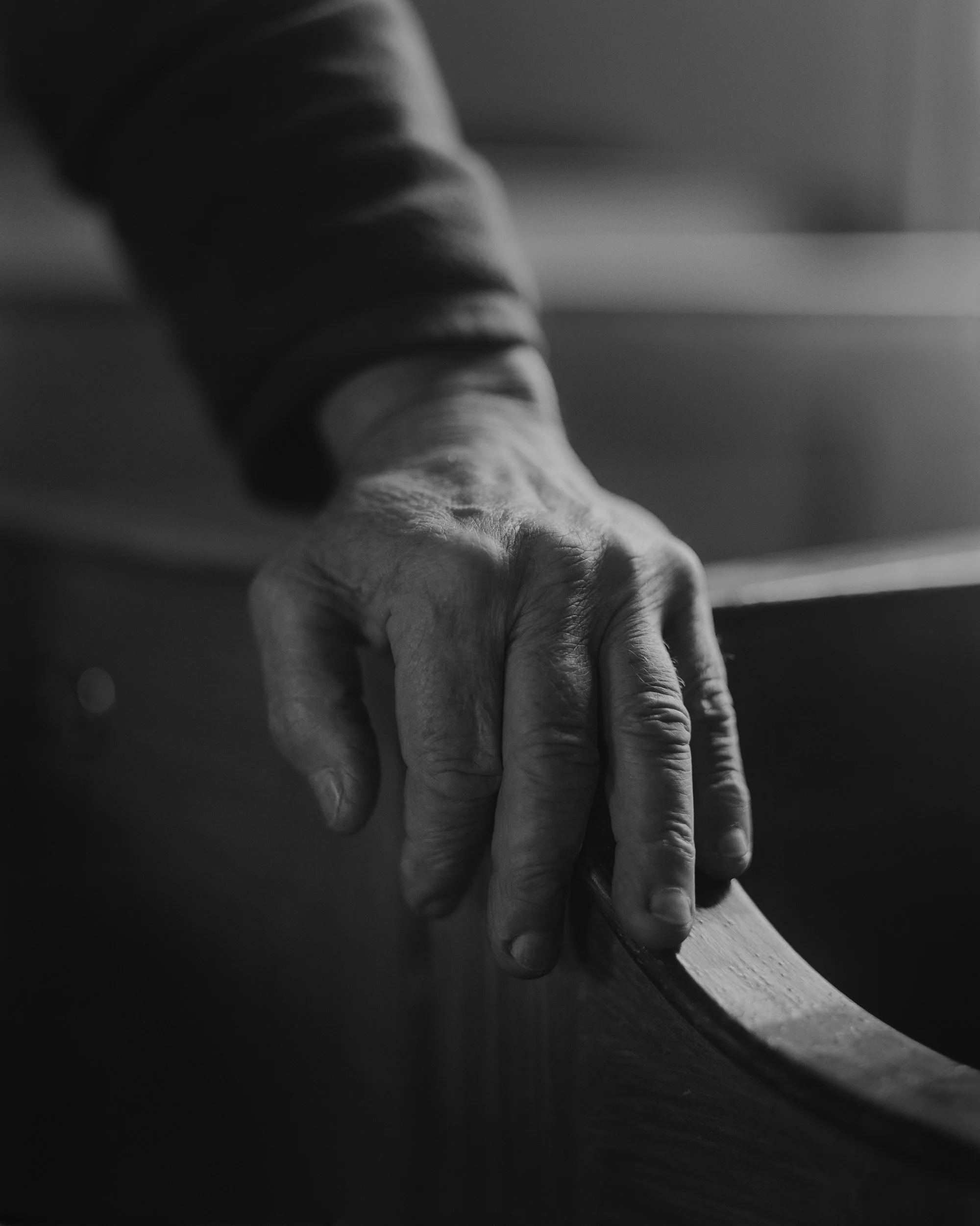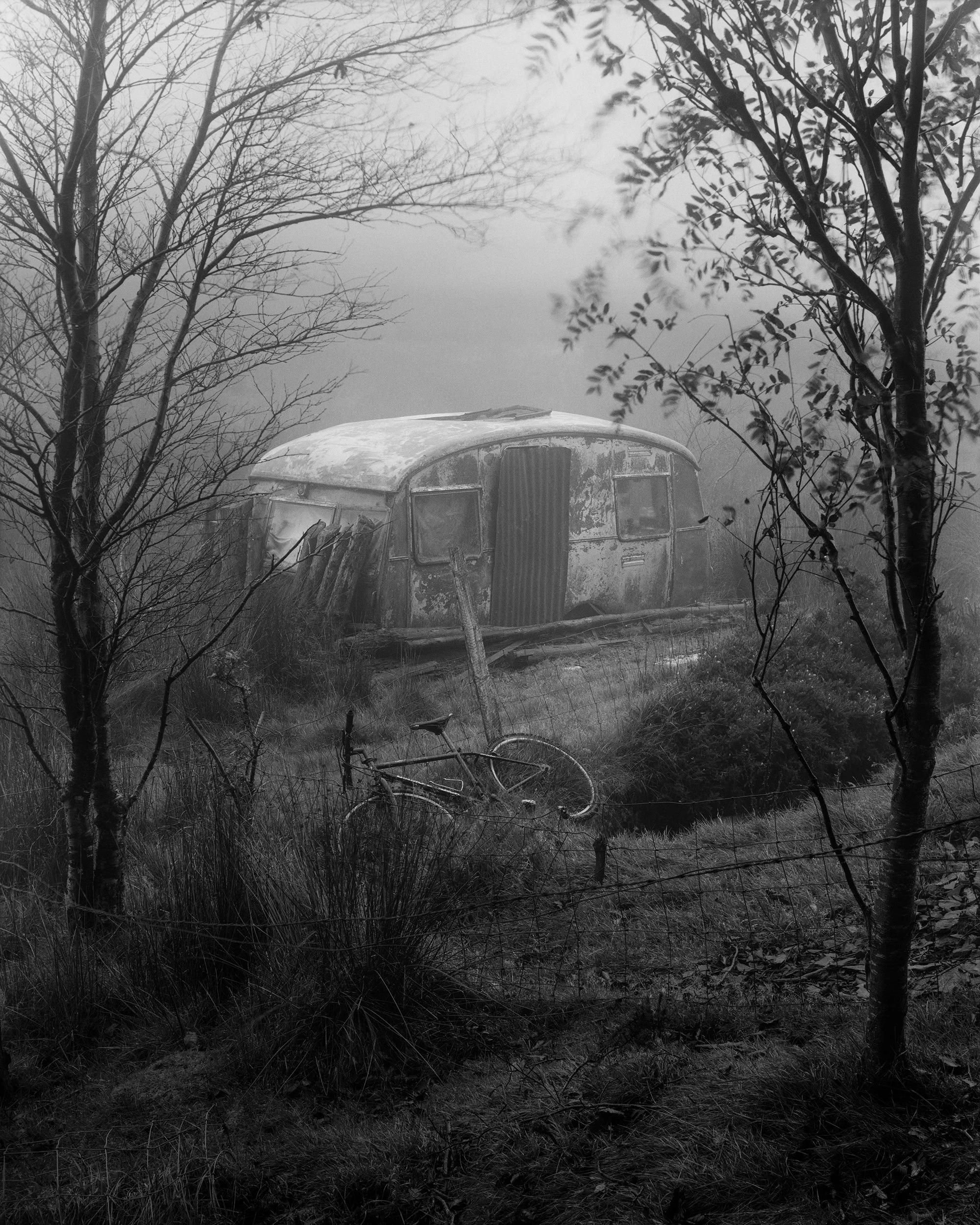 Ben has been returning to these mountains again and again since September 2023, and what he has assembled over that time is a body of work that is as much about absence as it is about presence. He photographs the people who remain and there are still some. Older hill farmers whose faces carry the kind of character that only photographers dream of; men who look as though they have been shaped by the same weather that sculpted the land around them. He photographs the departed just as compellingly. Ruined farmhouses reclaimed by moss and ivy. Abandoned buildings collapsing quietly into the hillside. A seemingly abandoned caravan amongst the trees with a bicycle slumped on a weak wire fence, together waiting for someone who is probably never coming back.