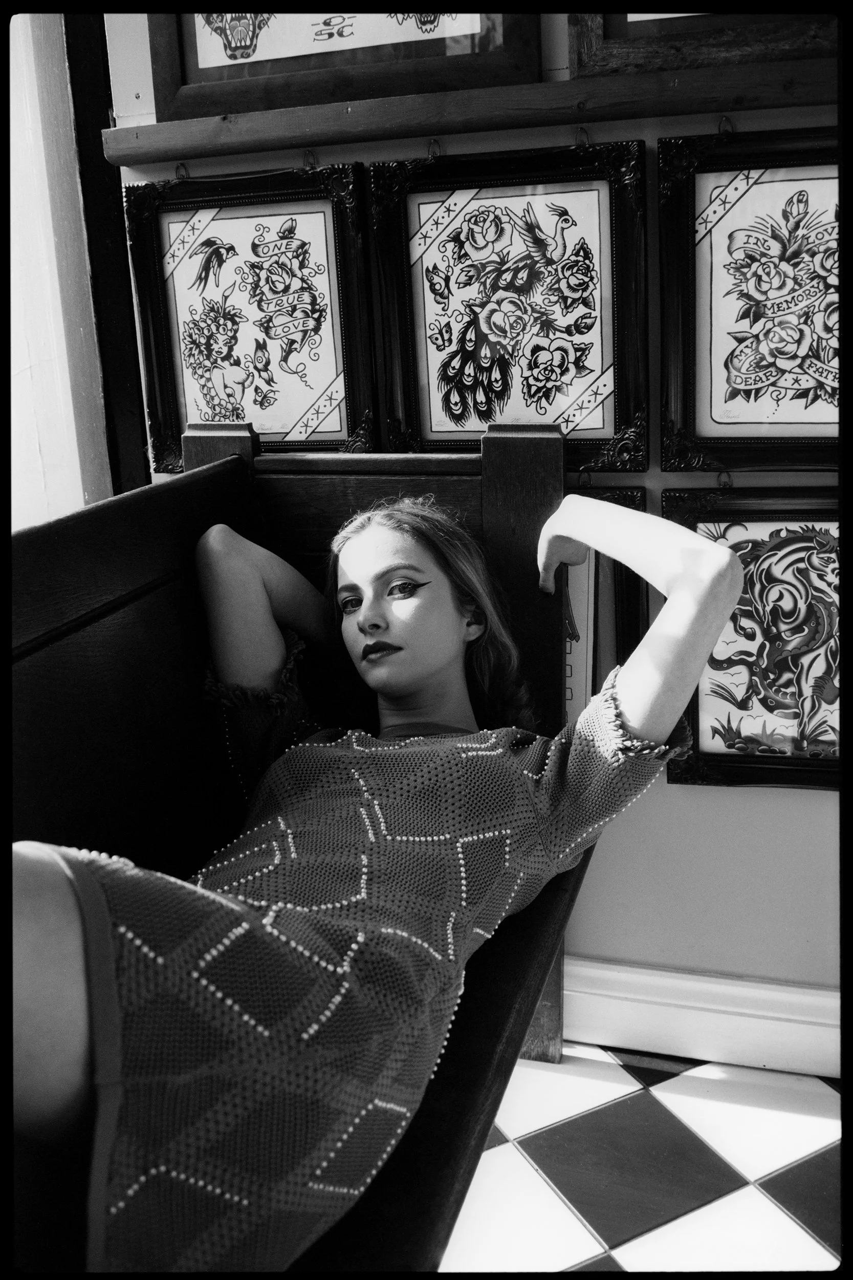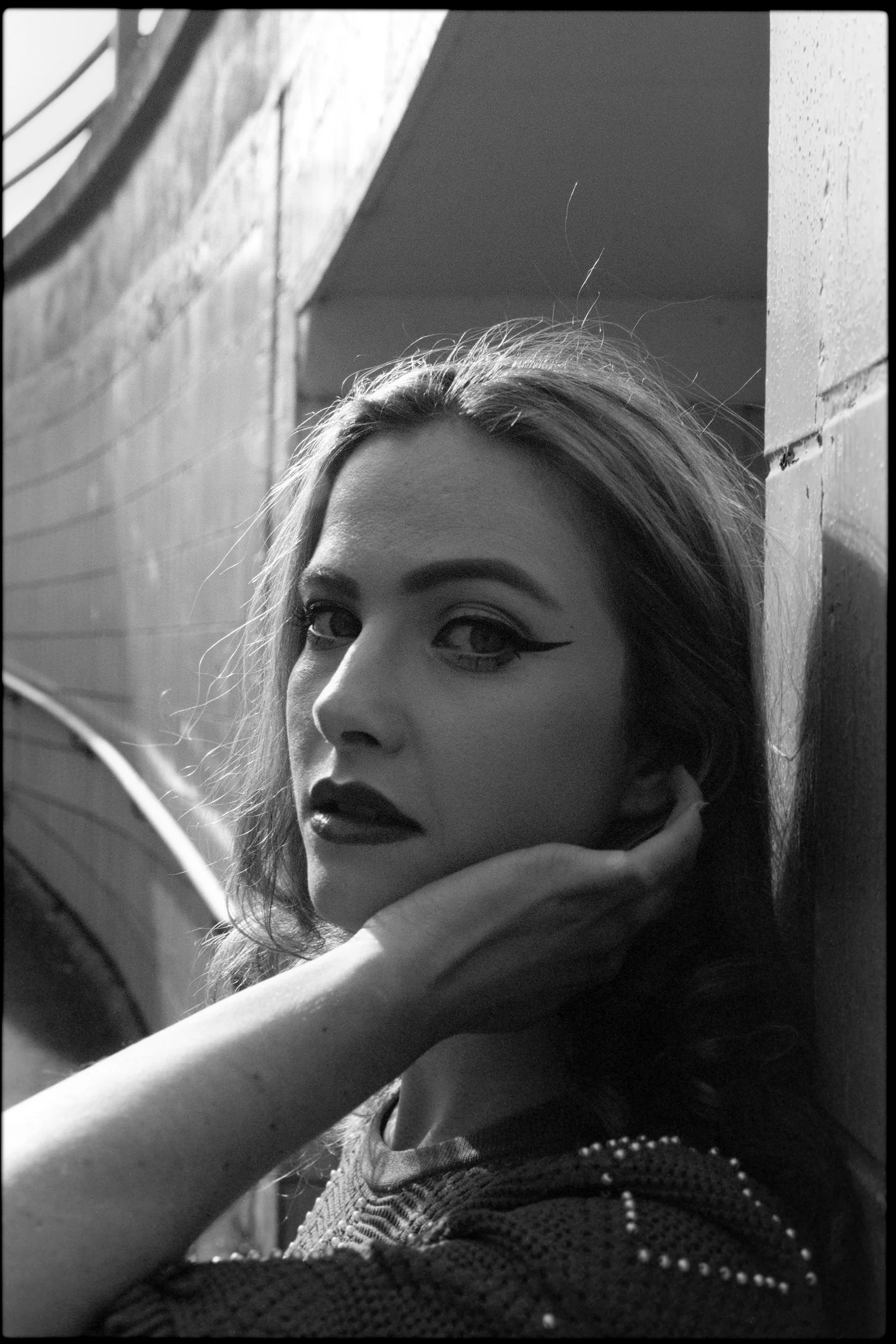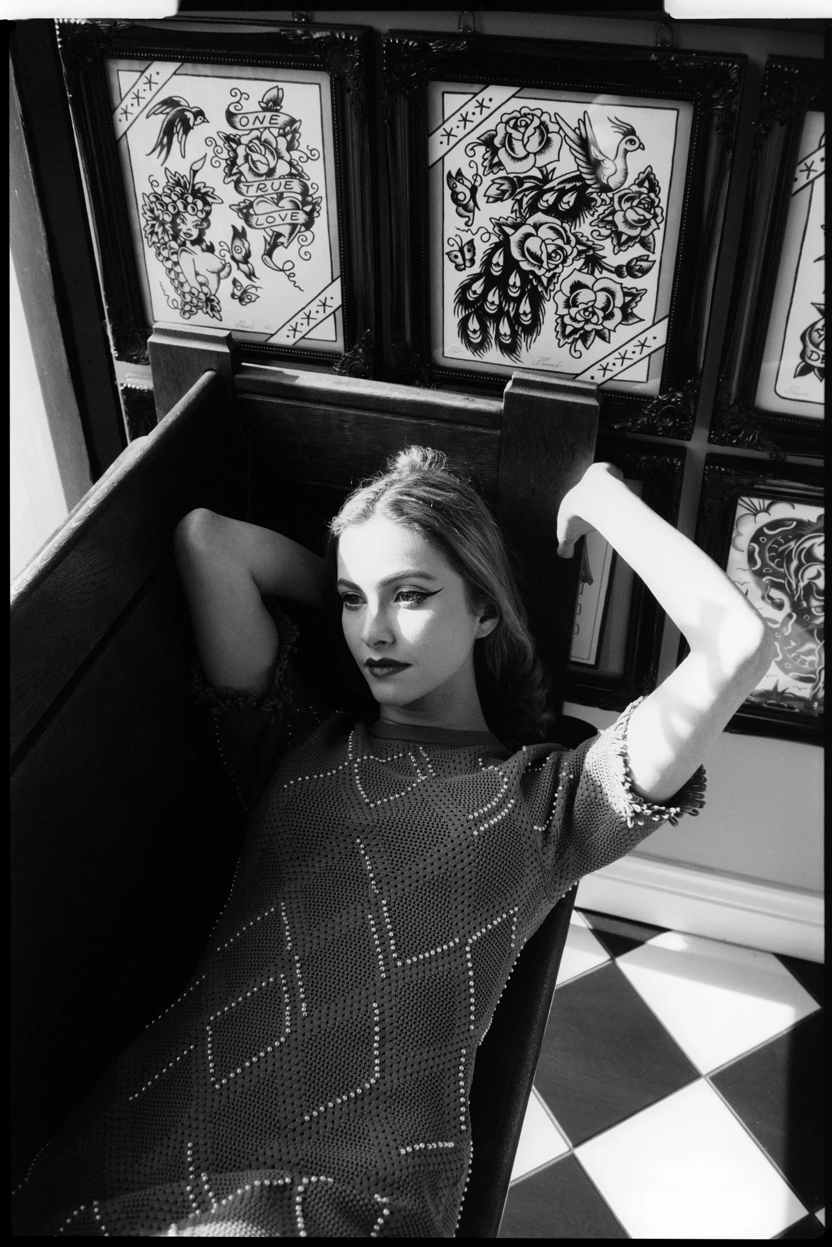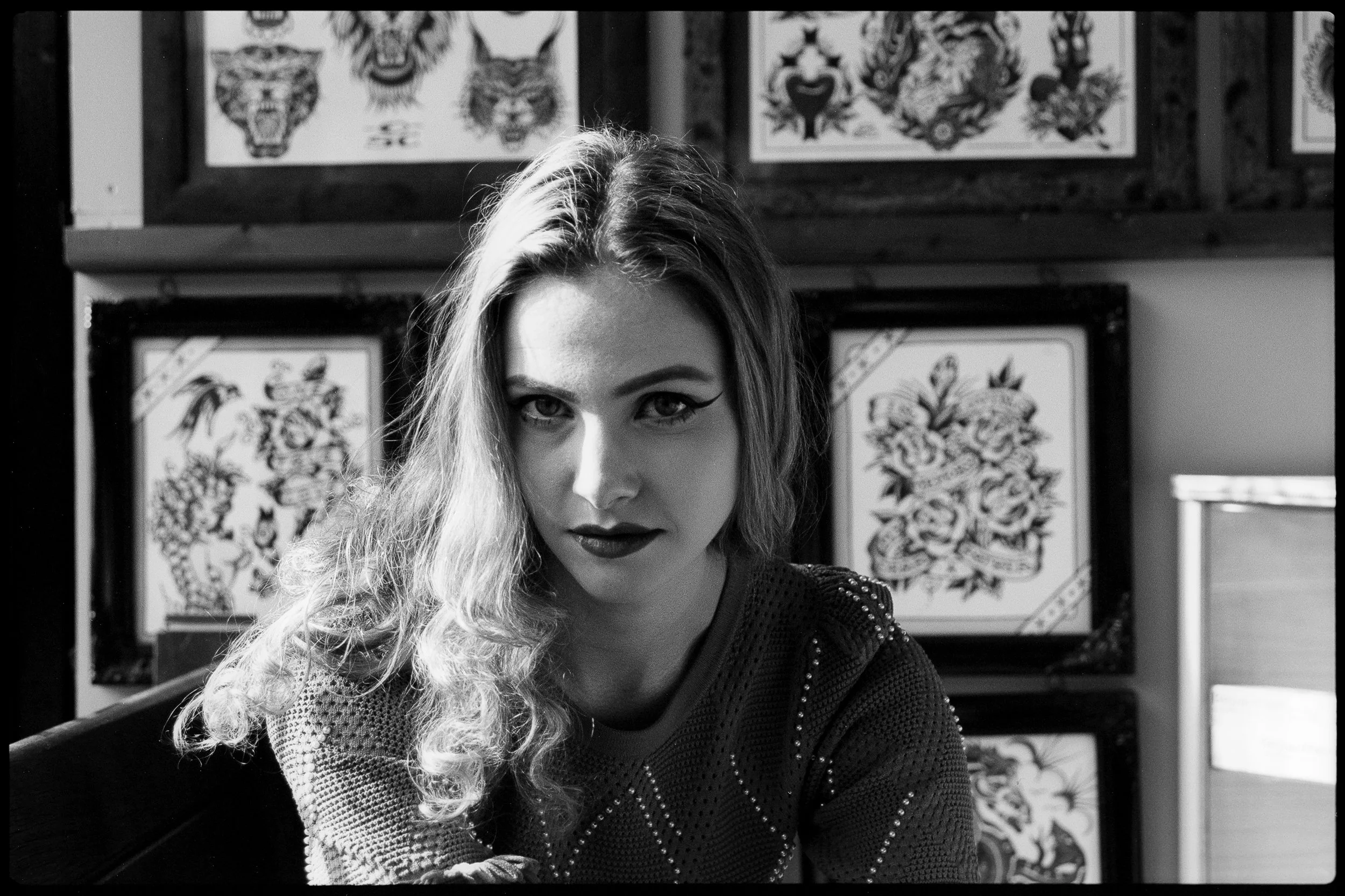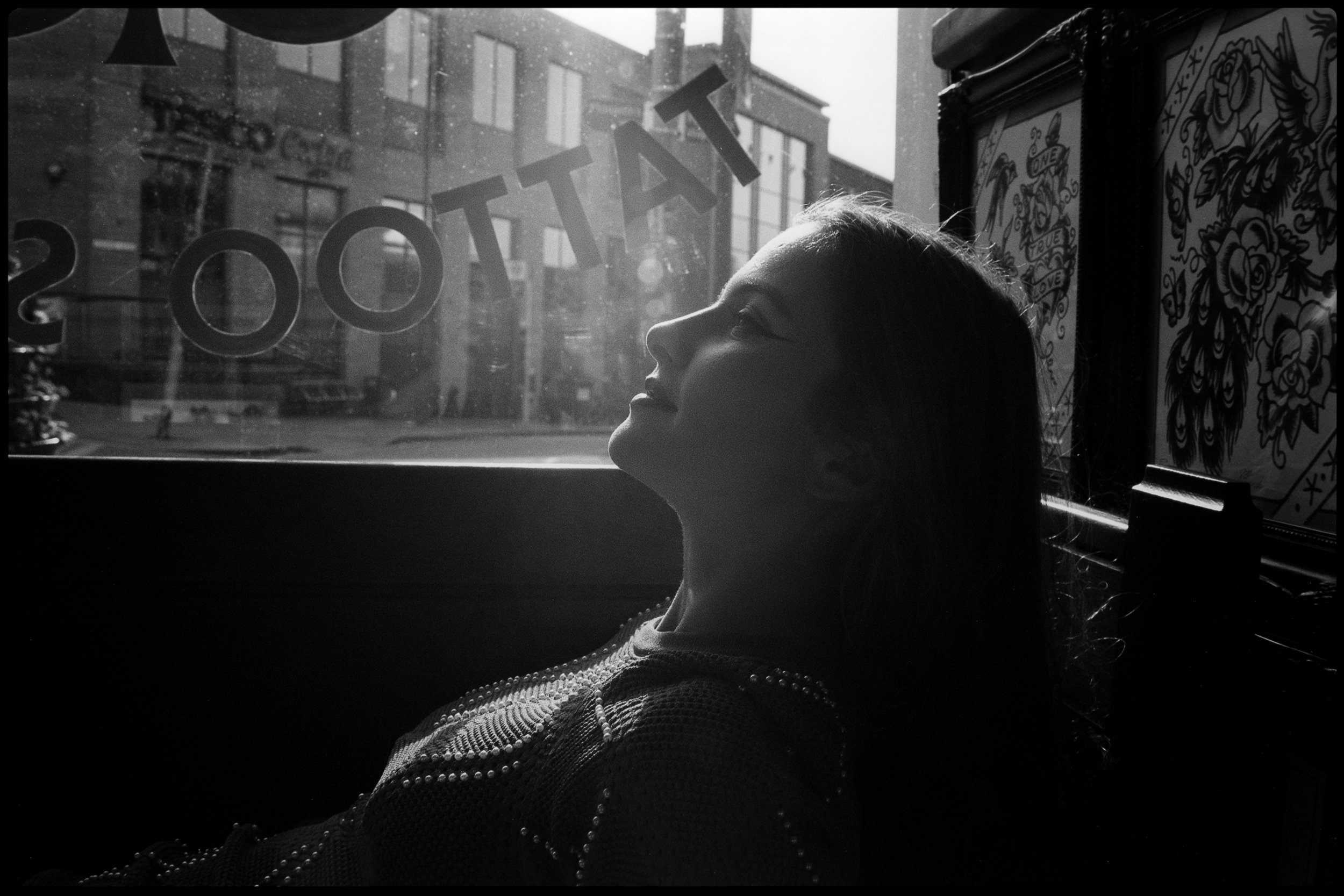 These photographs were made in hard bright light, different from my previous rolls of P30, having mostly been shot in soft or overcast light. They are hard, directional, high-contrast sun-filled frames. You can see it in the deep shadows and the almost blown-out highlights. These characteristics are most evident in the frames of Mia in the tattoo shop. There's real texture and atmosphere in this location. The tattoo flash sheets on the wall behind her are a gift, actually, because they're doing something visually very similar to the film itself: bold, graphic, black and white. Other frames show some more of P30’s subtle greys and mid-tones but always squeezed between its usual deep blacks and almost blinding whites. With this last roll of P30 (for now only, I hope) I tried to do something more demanding and it really responded well.