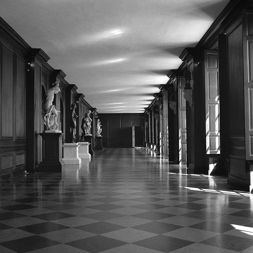 Shooting Kodak TMAX 400 film I was fairly sure that there would not be enough light to hand hold and so I bought a monopod with me. Sure enough in the interiors rooms at ƒ8 I needed 1/8, well within the usable limits of a monopod. Before shooting any interior shots I asked the staff if it was okay to use a monopod. The staff member consulted with a colleague on her walkie-talkie and said that a monopod was okay, however for future reference a tripod was not. At this point, I also established that the photos were not for commercial use and that in effect I was a tourist like the hundreds of others visitors surrounding me, all happily shooting away with their phones and DSLR's - on ISO6400 no doubt. Albeit I was using a rather strange contraption, a film camera.